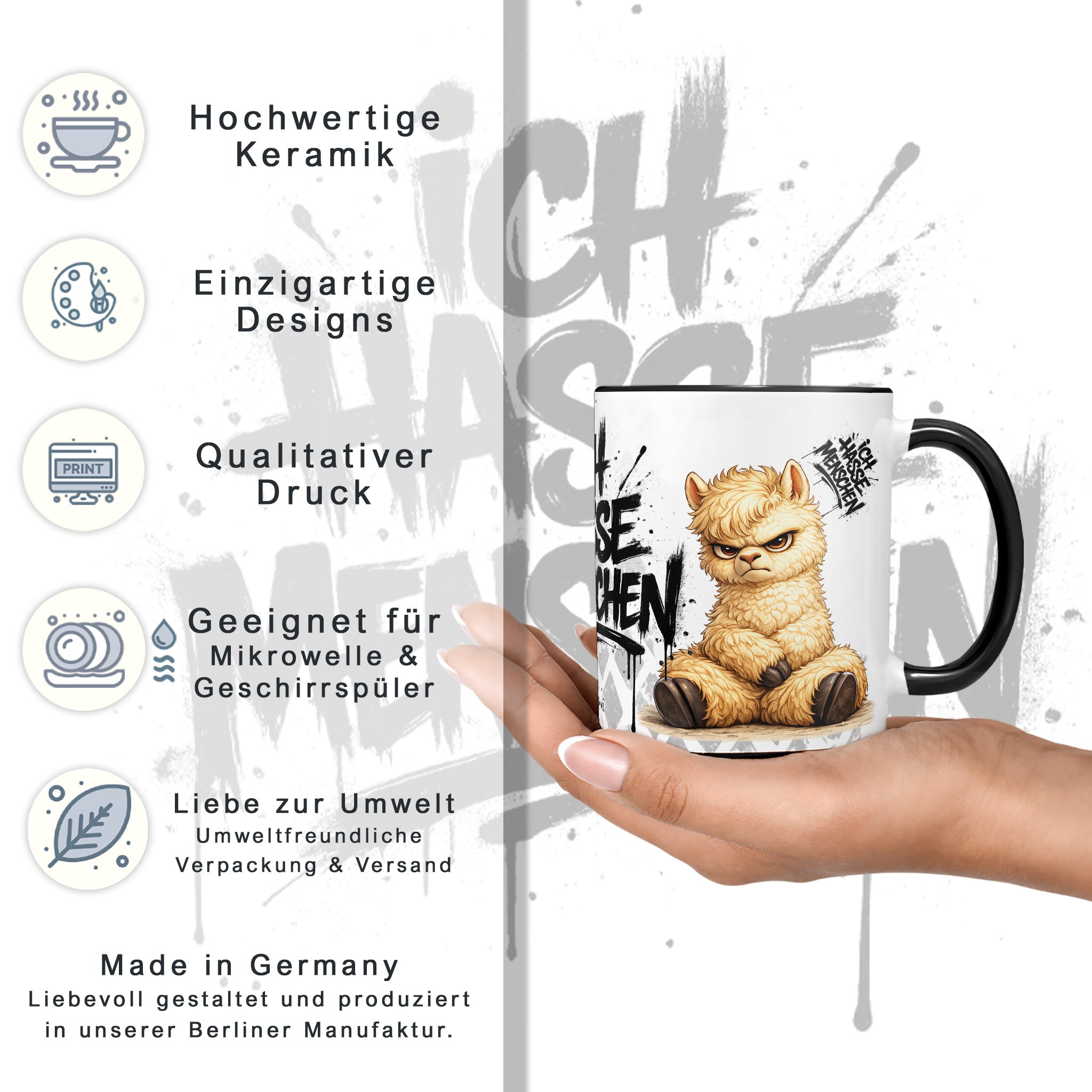 Manchmal sagt ein Blick alles – besonders, wenn er von einem flauschigen, aber ziemlich genervten Alpaka kommt. Unsere Tassenkollektion „Ich hasse Menschen“ bringt genau diesen Humor auf den Punkt: liebevoll gestaltete Tiermotive mit einem herrlich grummeligen Ausdruck.