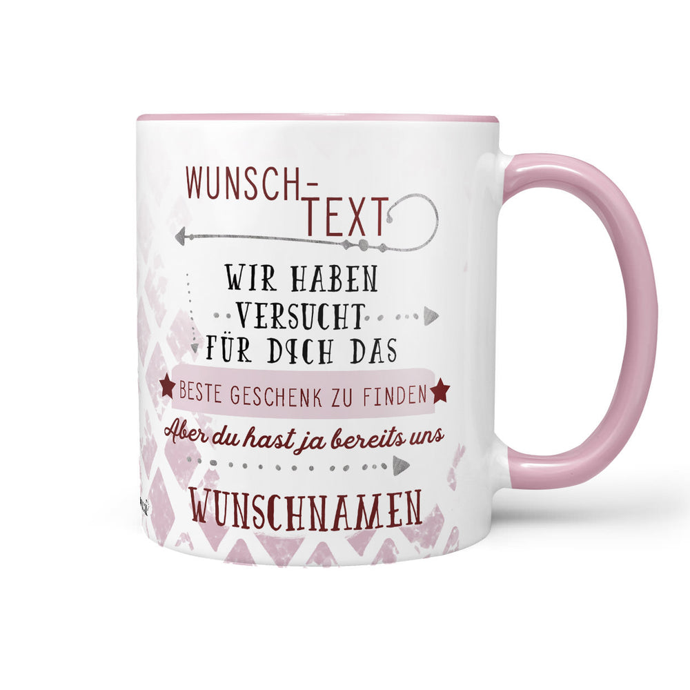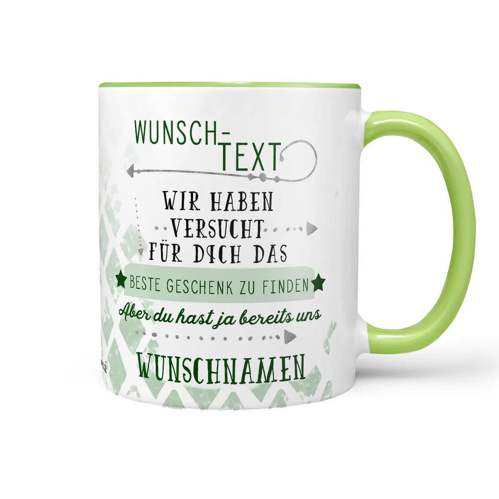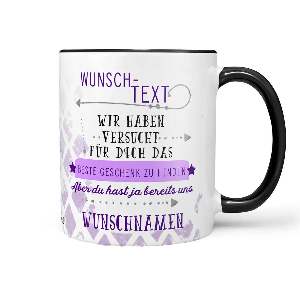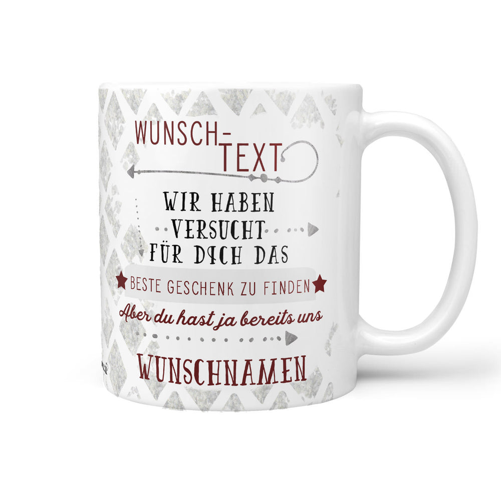 Unsere personalisierte Tasse Geschenk für Oma ist ein liebevolles Präsent, das direkt ins Herz trifft. Mit dem schönen Spruch „Wir haben versucht für dich das beste Geschenk zu finden – aber du hast ja bereits uns“ und den frei wählbaren Wunschnamen wird sie zu einem Erinnerungsstück, das täglich Freude bereitet.