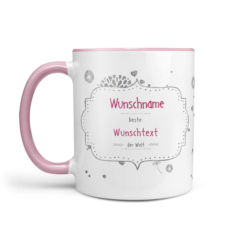 Du bestimmst, was oben und unten steht: Der Wunschname wird prominent platziert, darunter erscheint dein individueller Text wie z. B. „bester Opa der Welt“ oder „beste Freundin überhaupt“. Damit wird jede Tasse zum ganz persönlichen Geschenk mit Herz.