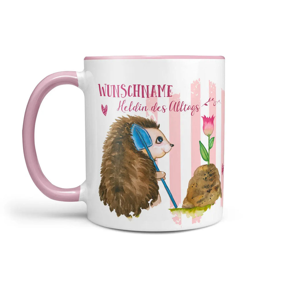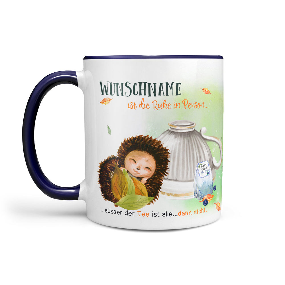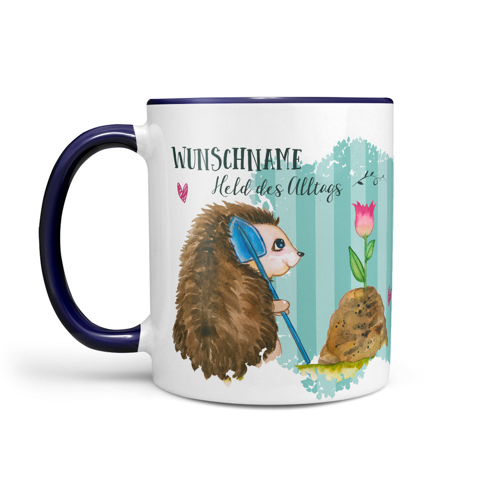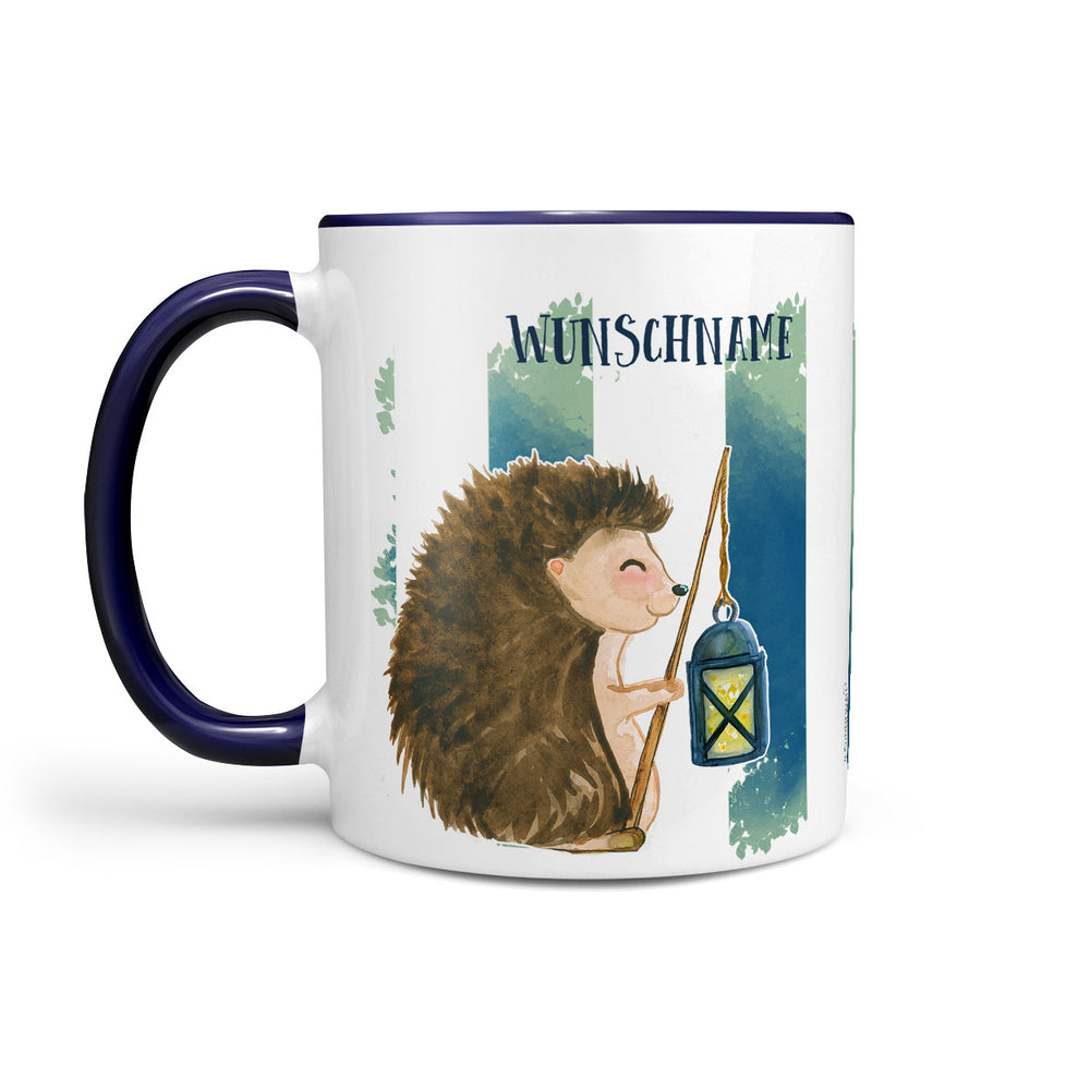 Tasse Igel mit Laterne – personalisiert mit Wunschname und blauem Henkel