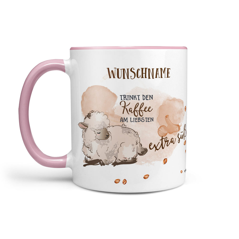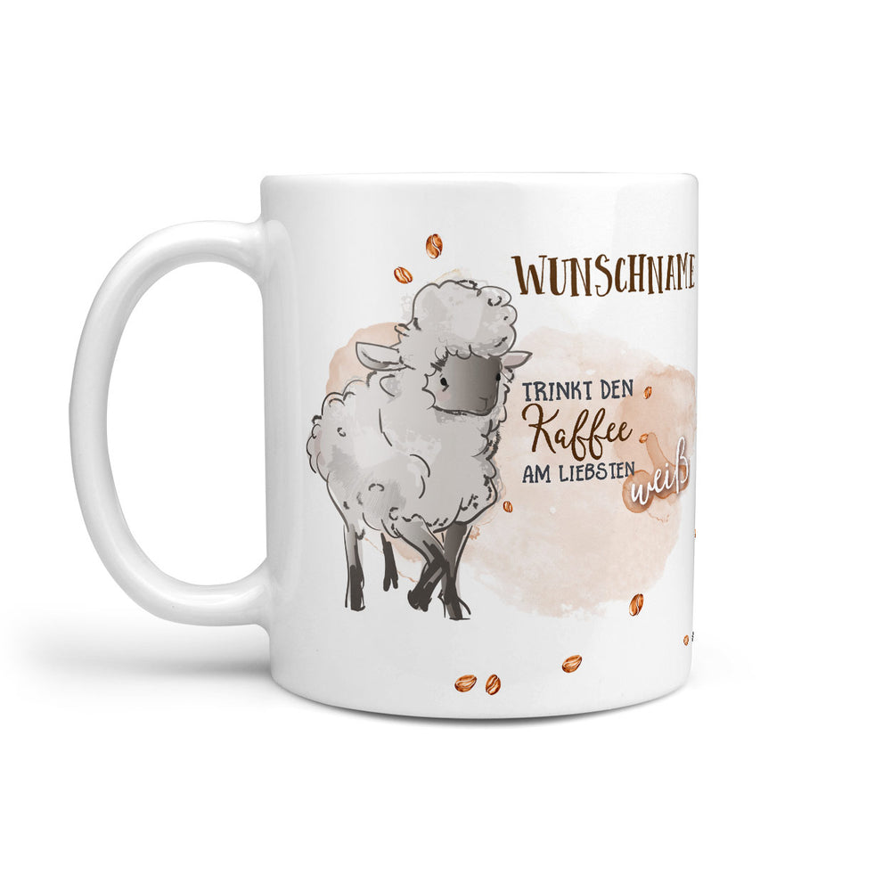 Tasse Kaffee schwarz – Schaf mit Wunschname und schwarzem Henkel