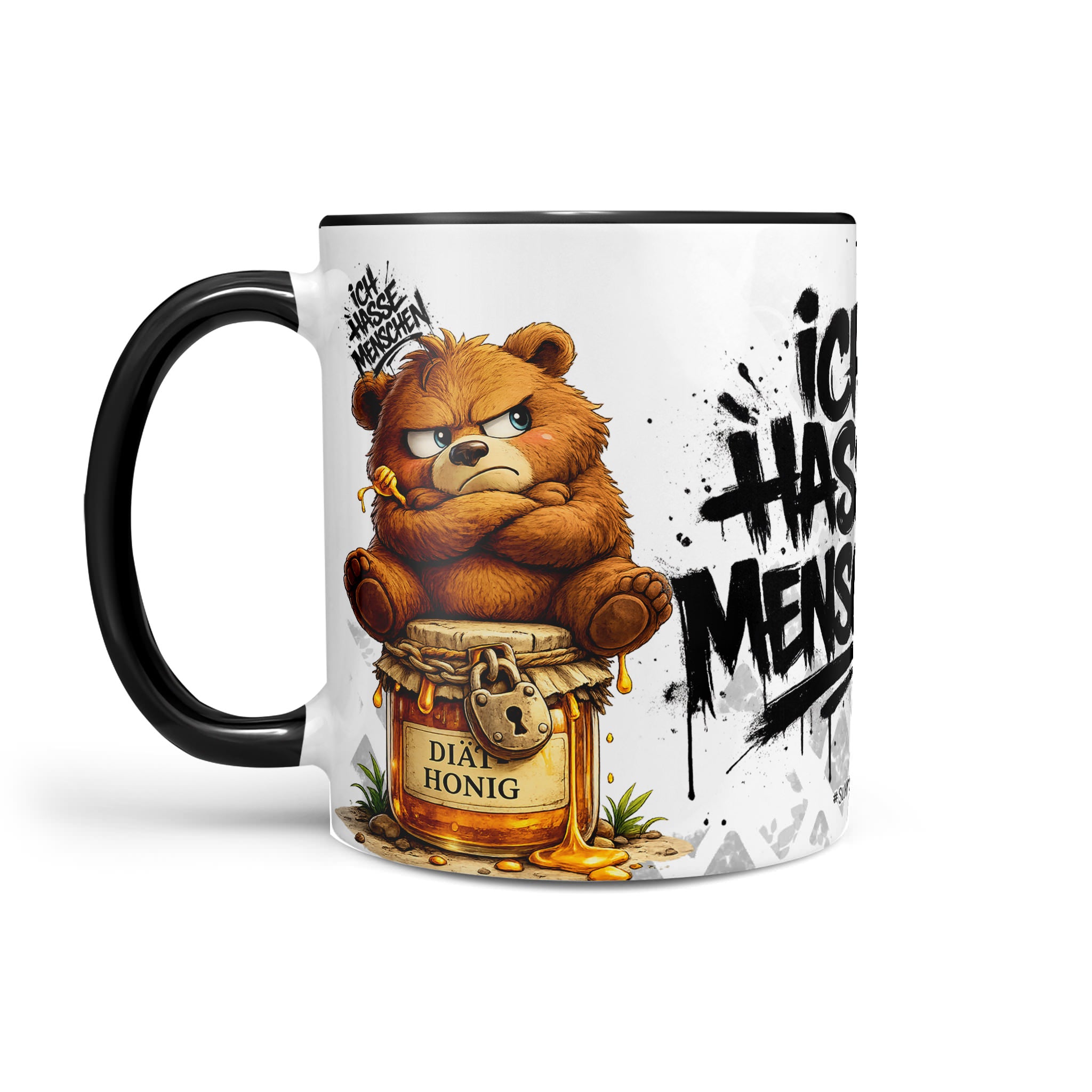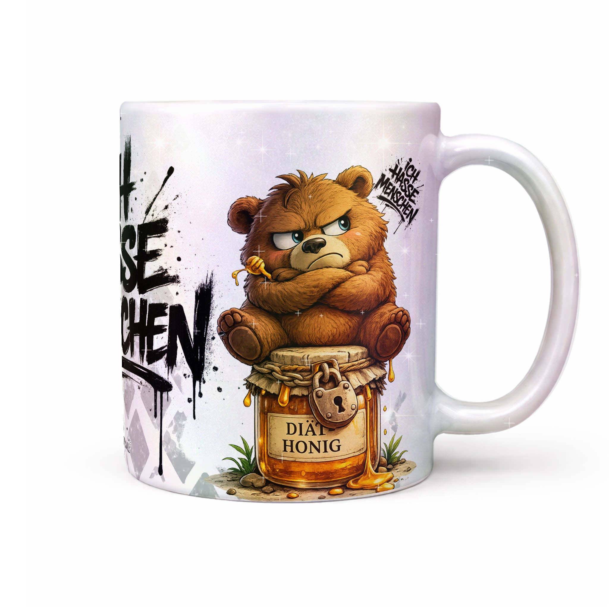 Tassenkollektion „Ich hasse Menschen“ – mit grummeligem Bär auf Honigglas