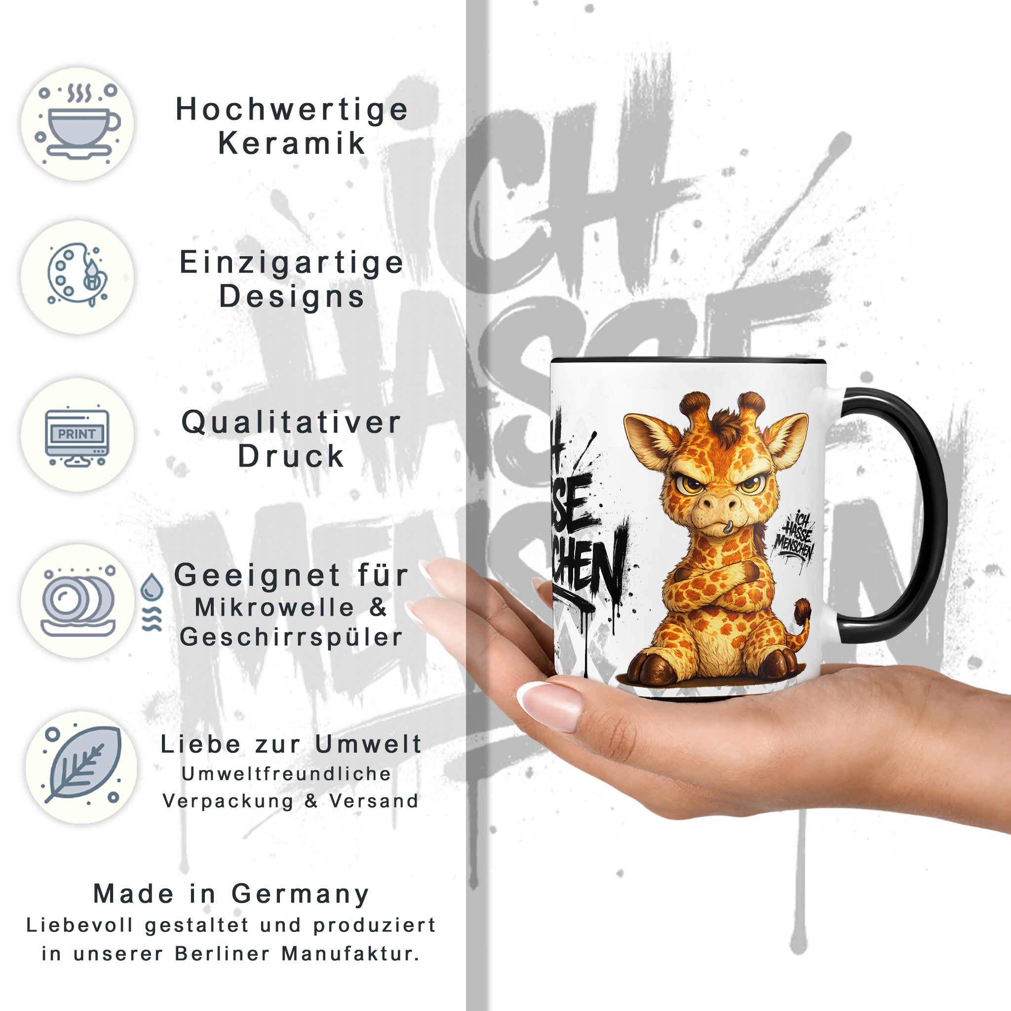 Tassenkollektion „Ich hasse Menschen“ – mit grummeliger Giraffe